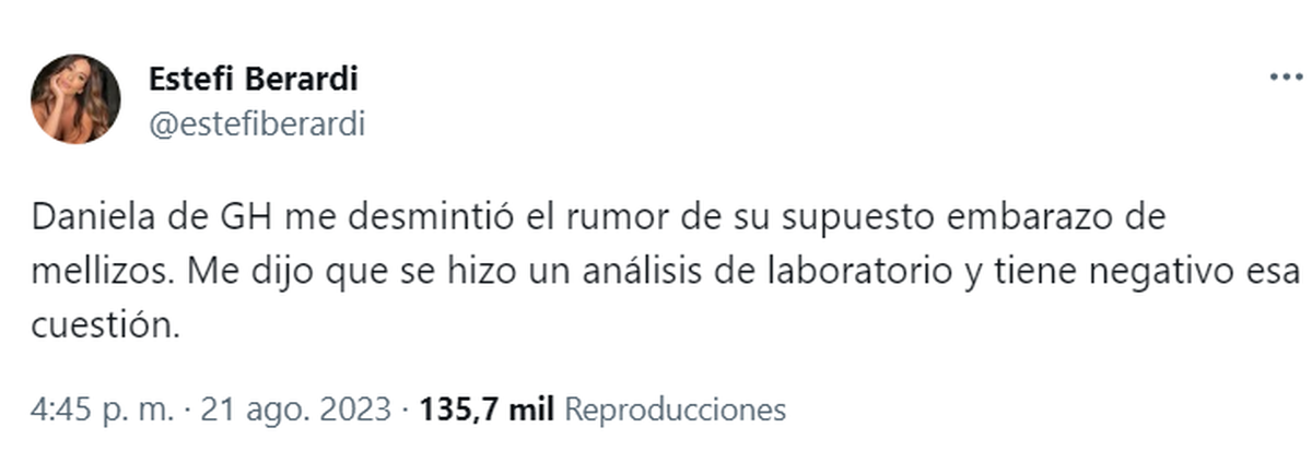 "Daniela de GH desmintió el rumor de su supuesto embarazo de mellizos. Me dijo que se hizo un análisis de laboratorio y tiene negativo esa cuestión", informó.