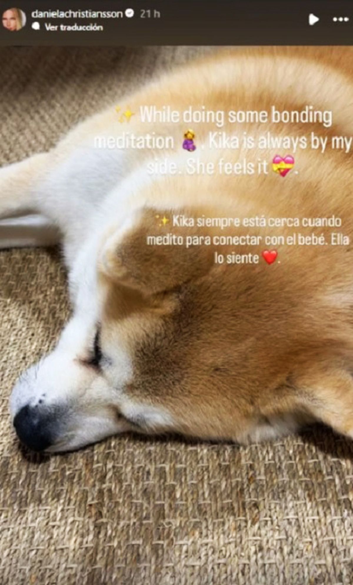 "While doing some bonding meditation. Kika is always by my side. She feels it (Kika siempre está cerca cuando medito para conectar con el bebé. Ella lo siente)", expresó en sus historias de Instagram Daniela Christiansson junto al emoji de un corazón a punto de ingresar en el octavo mes de su embarazo.