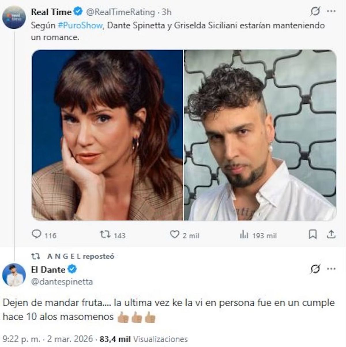 Por otro lado, el líder de Illya Kuryaki and de Valderramas también salió a desmentir la versión desde sus redes sociales. Fue a través de su cuenta de X que Dante Spinetta respondió una publicación que se había echo eco de la información de Puro Show dando por confirmado el vínculo entre ellos: “Dejen de mandar fruta... La última vez que la vi en persona fue en un cumple hace 10 años más o menos“, sentenció rotundo.