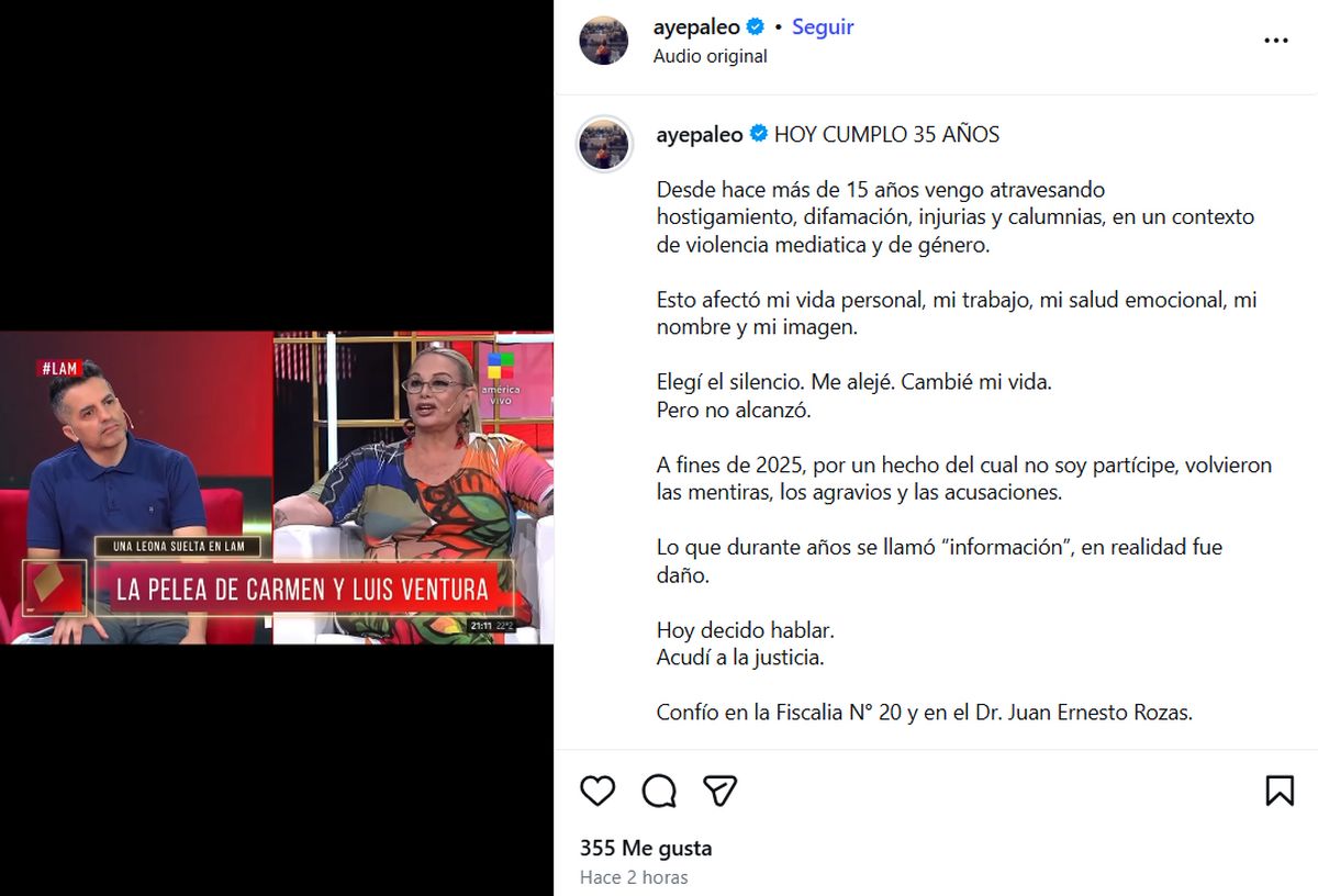 Con un video que recopila momentos en los que Barbieri habló de ella, Paleo escribió: "Desde hace más de 15 años vengo atravesando hostigamiento, difamación, injurias y calumnias, en un contexto de violencia mediática y de género".
