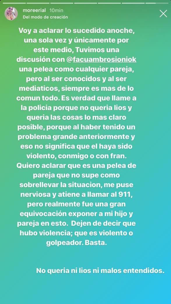 “Voy a aclarar lo sucedido anoche, una sola vez y únicamente por este medio. Tuvimos una discusión con Facundo Ambrosioni, una pelea como cualquier pareja, pero al ser conocidos y al ser mediáticos, siempre es más de lo común todo”, comenzó la joven.