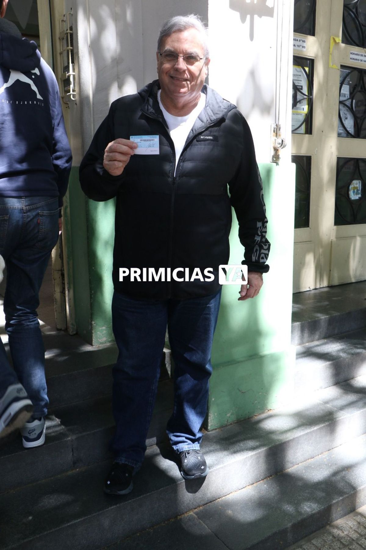 El periodista Carlos Monti posó con el DNI en la mano afuera del lugar de votación, sonriendo y mostrando su participación en las urnas.