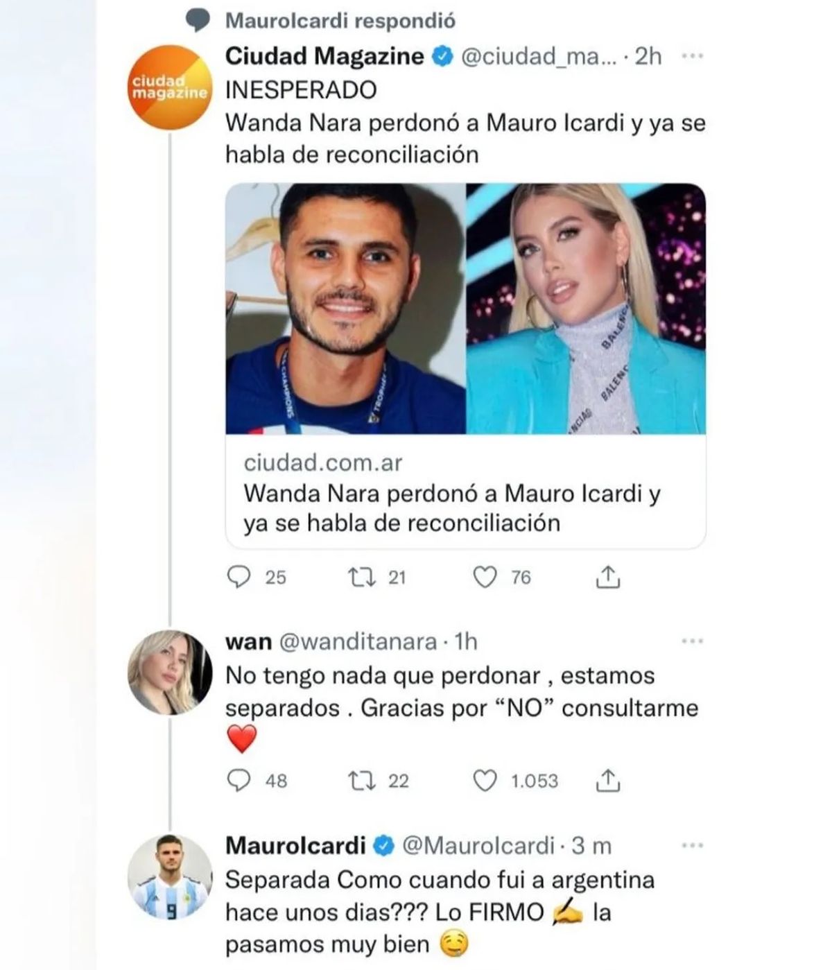 Luego, la cronista le preguntó a Wanda si estaba sola y ella afirmó segura: "Estoy sola". En todo momento, ambos evitaron ponerle un título al momento que pasan, donde están cada vez más juntos.