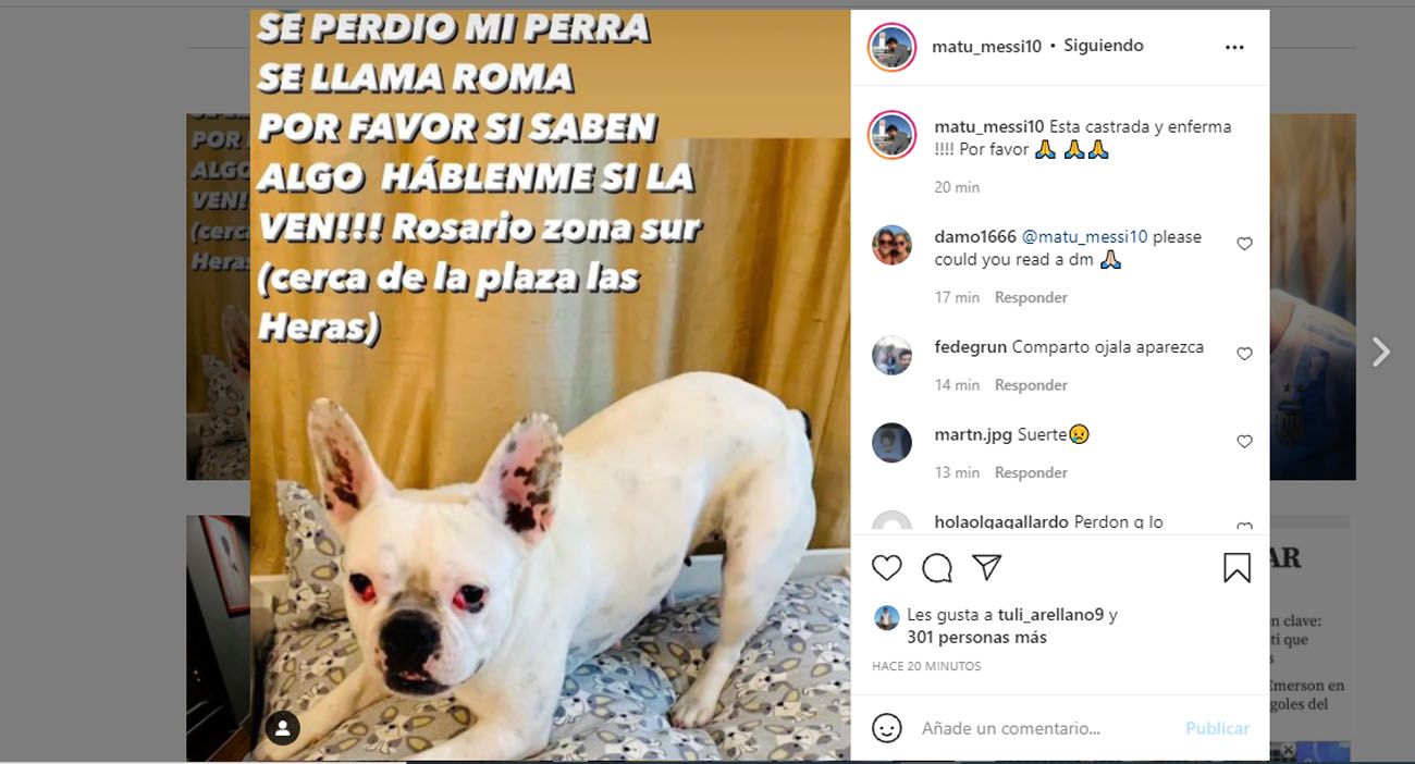 Uno de los hermanos de Lionel Messi, Matías Messi, atraviesa una desesperación familiar por el extravío de su perra llamada Roma.