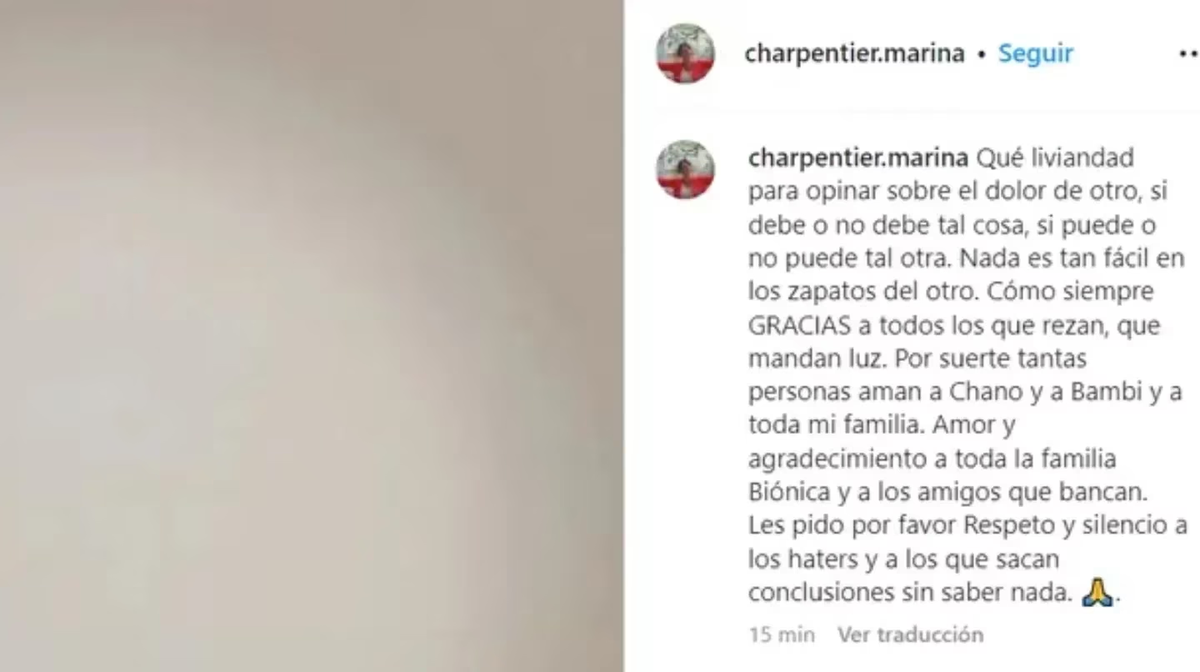 Marina Charpentier, madre de Chano Charpentier, rompió el silencio y publicó un fuerte comunicado a través de su cuenta de Instagram.