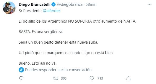 "Sr Presidente @alferdez. El bolsillo de los Argentinos NO SOPORTA otro aumento de NAFTA. BASTA. Es una vergüenza", indicó el periodista.