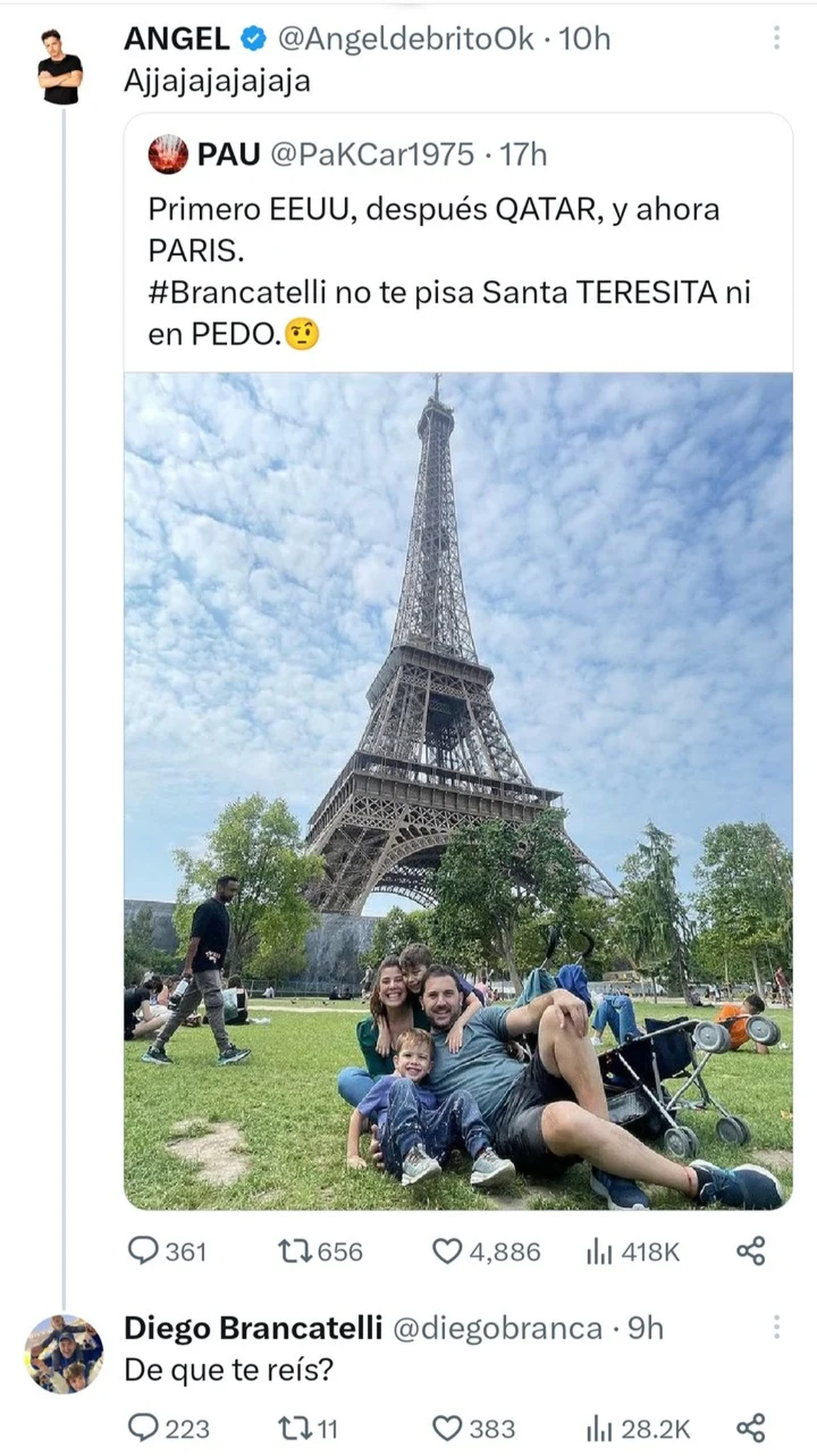 "Primero Estados Unidos, después Qatar y ahora París. Brancatelli no te pisa Santa Teresita ni en pedo", escribió un usuario en Twitter, que eligió una foto de Brancatelli en París para ilustrar la publicación.