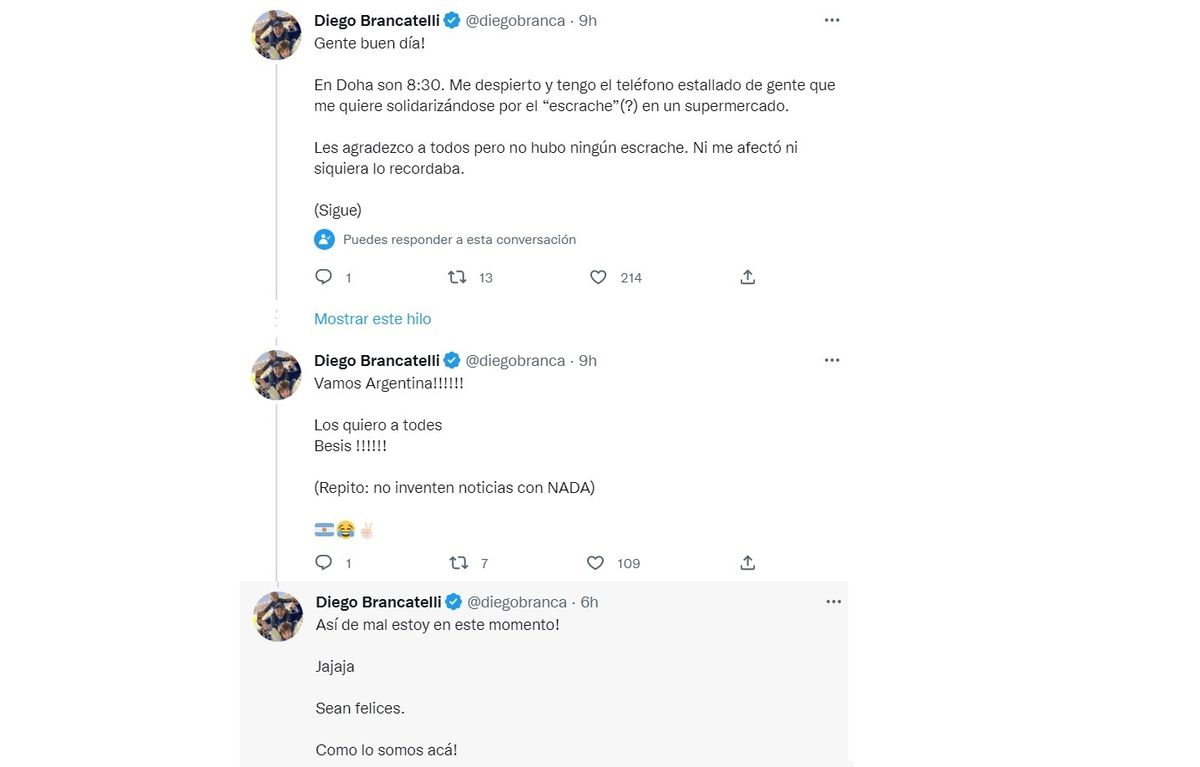 Diego Brancatelli utilizó su cuenta de Twitter para referirse a este episodio en el supermercado de Qatar tras la trascendencia que tomó en los medios y redes sociales el video y aclaró que no lo vivió como un "escrache".
