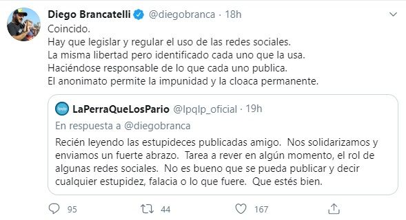 "Hay que legislar y regular el uso de las redes sociales. La misma libertad pero identificado cada uno que la usa. Haciéndose responsable de lo que cada uno publica. El anonimato permite la impunidad y la cloaca permanente", amplió Diego.
