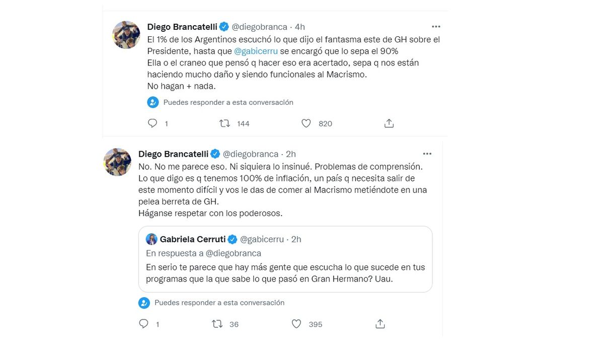 A lo que Brancatelli remarcó certero: "No. No me parece eso. Ni siquiera lo insinué. Problemas de comprensión. Lo que digo es q tenemos 100% de inflación, un país q necesita salir de este momento difícil y vos le das de comer al Macrismo metiéndote en una pelea berreta de GH. Háganse respetar con los poderosos".