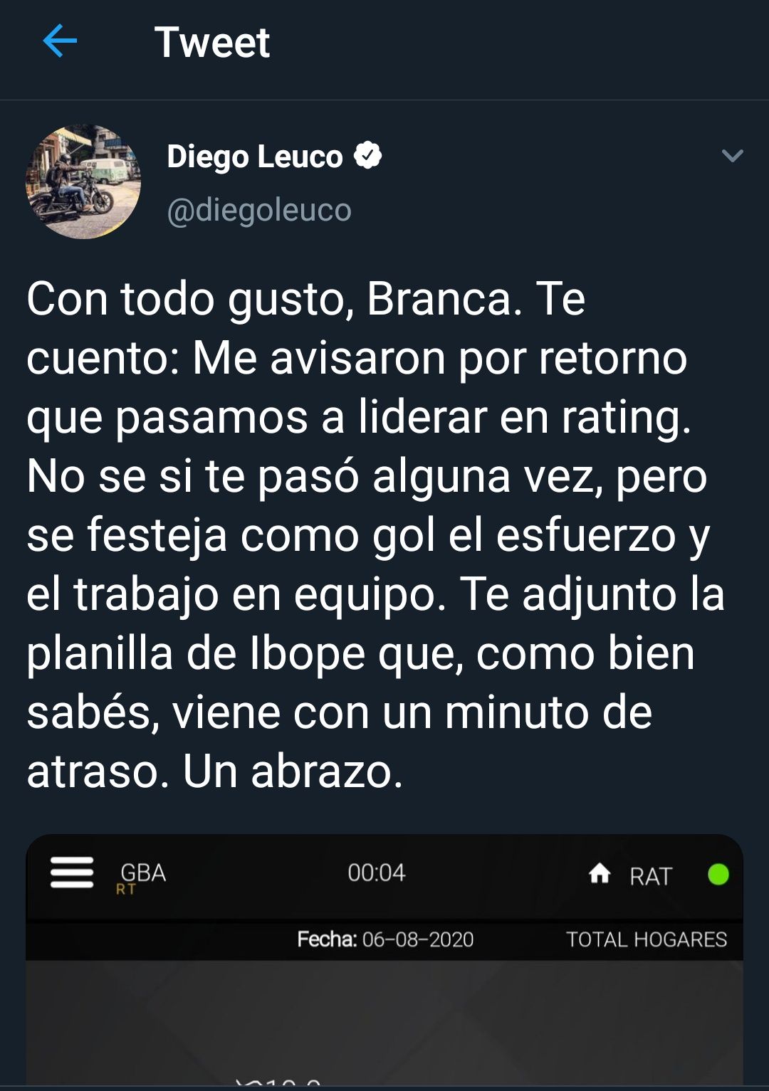 "Está bien no hay que festejar el rating en cámara", admitió como autocrítica y agregó: "El rating no es una frivolidad, es simplemente la expresión de que lo que uno le está haciendo le interesa mucha gente y eso es gratificante", analizó.