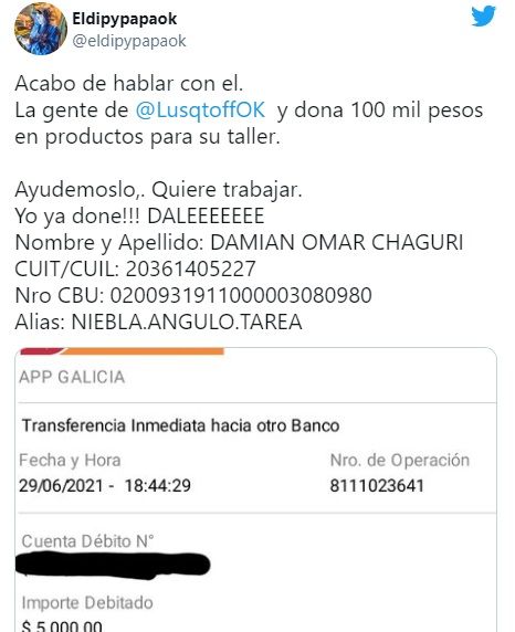 Y luego arengó a sus seguidores a colaborar como lo hizo él: "Acabo de hablar con él. La gente de Lusqtoff Argentina dona 100 mil pesos en productos para su taller. Ayudémoslo. Quiere trabajar. Yo ya doné!!! DALEEEEEEE Nombre y Apellido: DAMIAN OMAR CHAGURI CUIT/CUIL: 20361405227 Nro CBU: 0200931911000003080980 Alias: NIEBLA.ANGULO.TAREA".