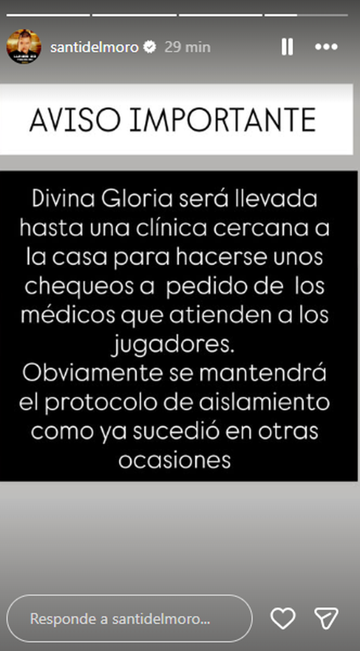 El conductor Santiago del Moro compartió en sus historias de Instagram detalles sobre lo que ocurrirá con la participante. “Divina Gloria será llevada hasta una clínica cercana a la casa para hacerse unos chequeos a pedido de los médicos que atienden a los jugadores. Obviamente se mantendrá el protocolo de aislamiento como ya sucedió en otras ocasiones”, explicó.