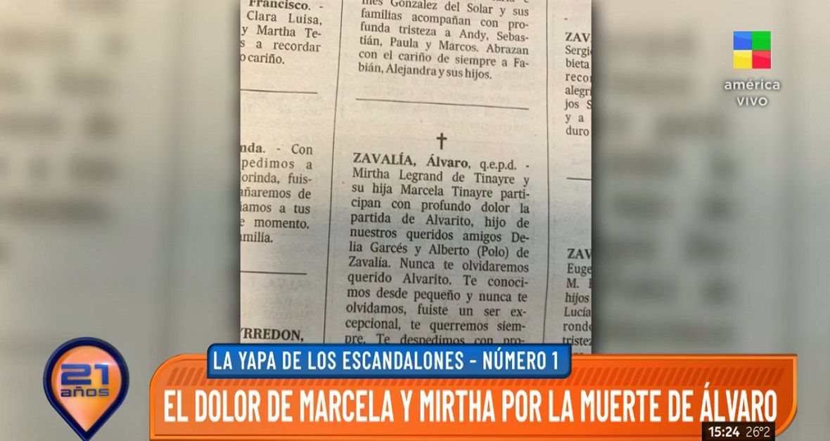 El hijo de la actriz falleció en un accidente automovilístico y Rodrigo Lussich mostró en "Los Escandalones" de "Intrusos" el aviso fúnebre donde Mirtha y Marcela despedían a Álvaro.