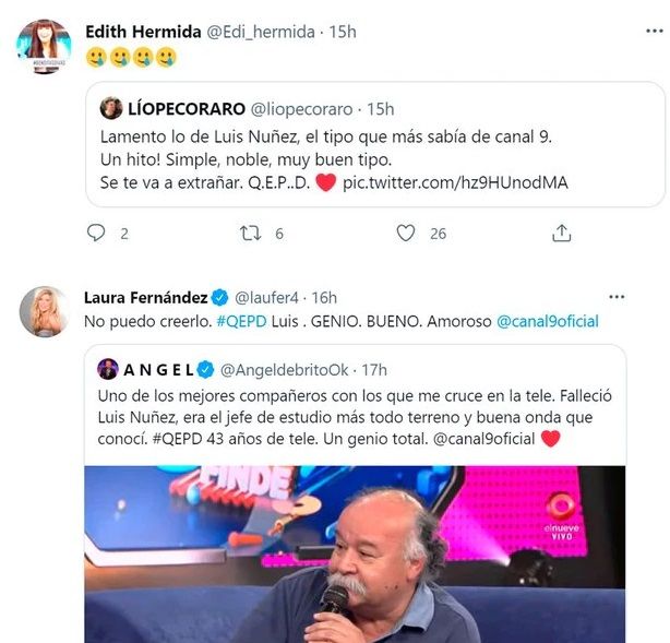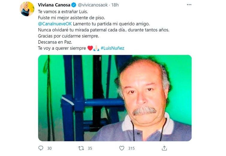 “Te vamos a extrañar, Luis. Fuiste mi mejor asistente de piso. Lamento tu partida mi querido amigo. Nunca olvidaré tu mirada paternal cada día durante tantos años. Gracias por cuidarme siempre. Descansa en paz. Te voy a querer siempre”, expresó con dolor Canosa.