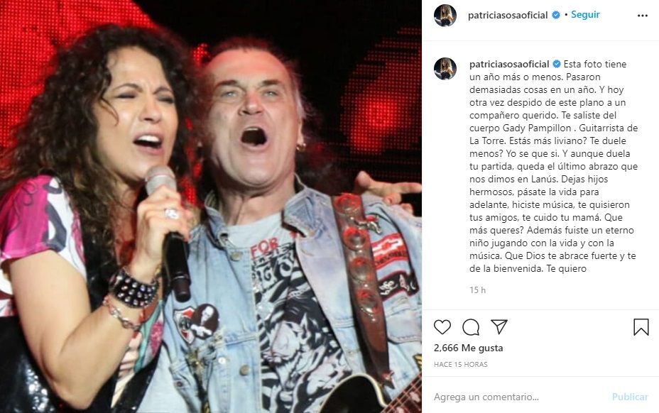Y siguió: "Te saliste del cuerpo Gady Pampillon . Guitarrista de La Torre. Estás más liviano? Te duele menos? Yo se que si. Y aunque duela tu partida, queda el último abrazo que nos dimos en Lanús".