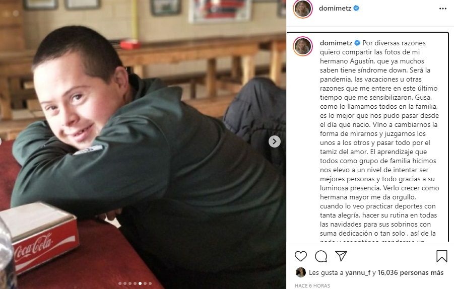 "El aprendizaje que todos como grupo de familia hicimos nos elevo a un nivel de intentar ser mejores personas y todo gracias a su luminosa presencia. Verlo crecer como hermana mayor me da orgullo, cuando lo veo practicar deportes con tanta alegría, hacer su rutina en todas las navidades para sus sobrinos con suma dedicación o tan solo , así de la nada y espontáneo mandarme un mensaje solo para decirme que me quiere, todo eso para mi es ganancia y agradecimiento", remarcó Domi.