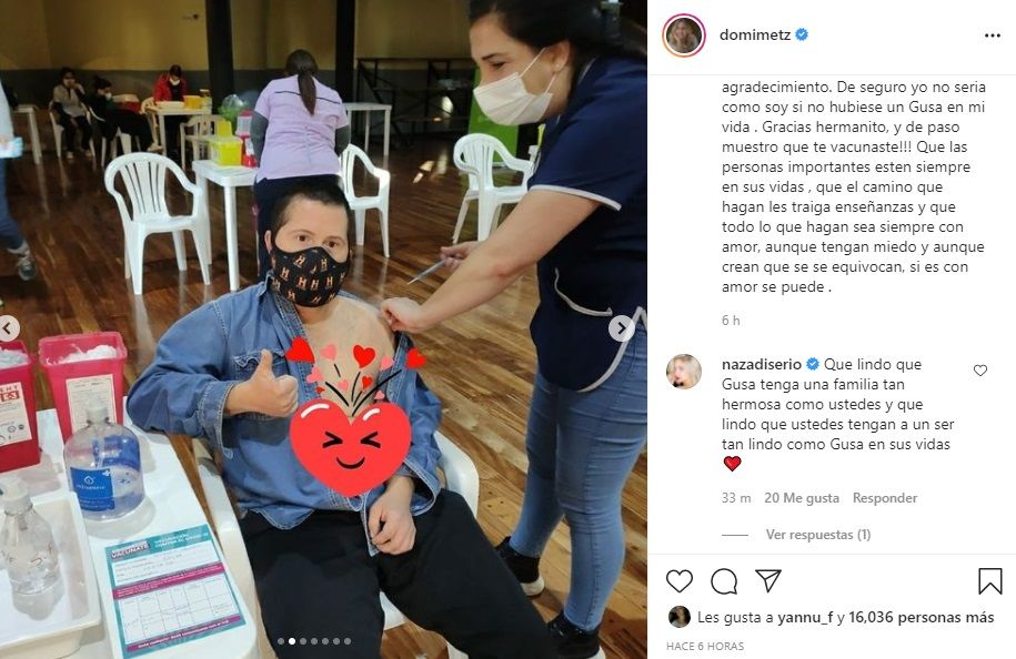 Y cerró emocionada: "De seguro yo no seria como soy si no hubiese un Gusa en mi vida. Gracias hermanito, y de paso muestro que te vacunaste!!! Que las personas importantes estén siempre en sus vidas, que el camino que hagan les traiga enseñanzas y que todo lo que hagan sea siempre con amor, aunque tengan miedo y aunque crean que se se equivocan, si es con amor se puede".