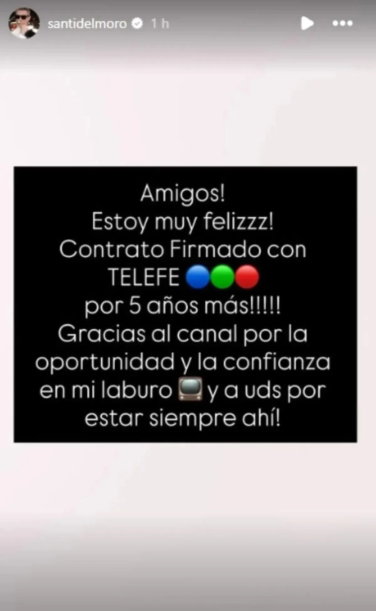 La renovación del contrato de Santiago del Moro con Telefe, firmada a mediados de octubre, no pasó inadvertida entre sus seguidores. Apenas se confirmó, el conductor acudió a sus redes para celebrar el acuerdo. En sus historias de Instagram expresó su alegría con un mensaje directo a su audiencia: “Amigos, estoy muy feliz, contrato firmado con Telefe por 5 años más, gracias al canal por la oportunidad y la confianza en mi laburo y a ustedes por estar siempre ahí”. Con esas palabras dejó en claro el entusiasmo por esta nueva etapa y la importancia que tiene para él continuar ligado al canal líder del país. El acuerdo prolonga su presencia en una pantalla que domina el rating y afianza su vínculo con una de las señales más influyentes del entretenimiento local.