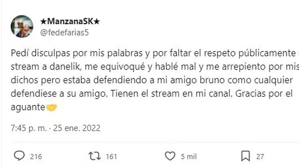 “Pedí disculpas por mis palabras y por faltar el respeto públicamente en stream a Danelik. Me equivoqué y hablé mal y me arrepiento por mis dichos pero estaba defendiendo a mi amigo Bruno como cualquiera defendiese a su amigo. Tienen el stream en mi canal. Gracias por el aguante”, expresó el participante de GH a principios del 2022.