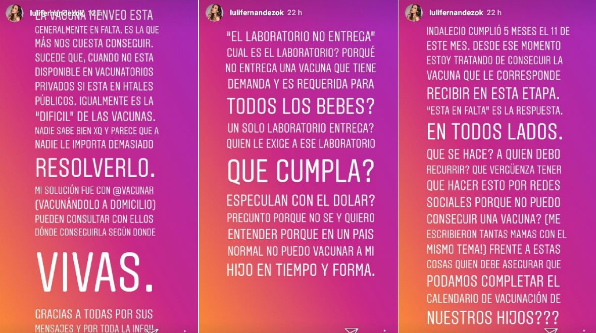 Y agregó: “¿Qué se hace? ¿A quién debo recurrir? Qué vergüenza tener que hacer esto por redes sociales porque no puedo conseguir una vacuna. Me escribieron tantas mamás con el mismo tema. Frente a estas cosas, ¿quién debe asegurar que podamos completar el calendario de vacunación de nuestros hijos?”.