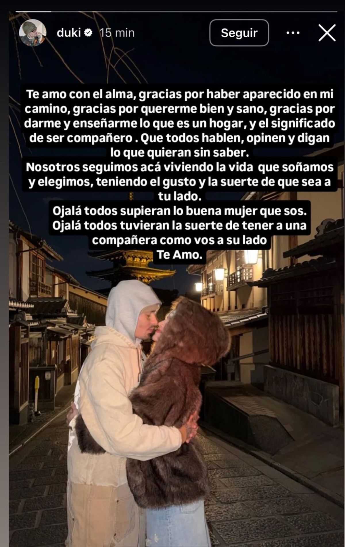 Lejos de esquivar el conflicto, Duki redobló la apuesta y dejó en claro que el vínculo con Emilia sigue firme: “Nosotros seguimos acá viviendo la vida que soñamos y elegimos, teniendo el gusto y la suerte de que sea a tu lado”.