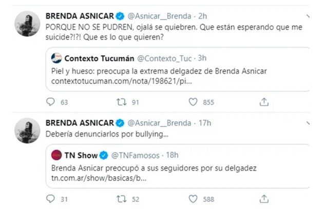 Asnicar contestó furiosa en Twitter a las notas que hablaban de una preocupación sobre su peso: “¿Por qué no se pudren? Ojalá se quiebren. ¿Qué están esperando? ¿Que me suicide? ¿Qué es lo que quieren?”, manifestó, molesta.