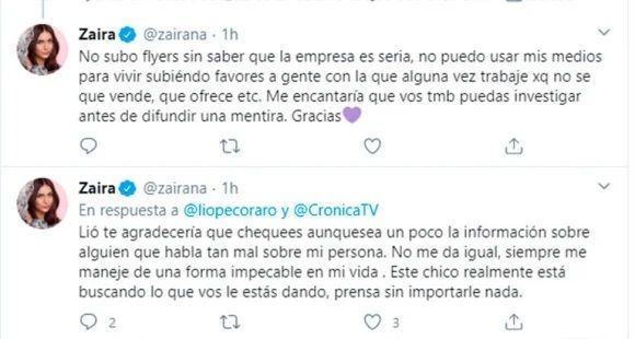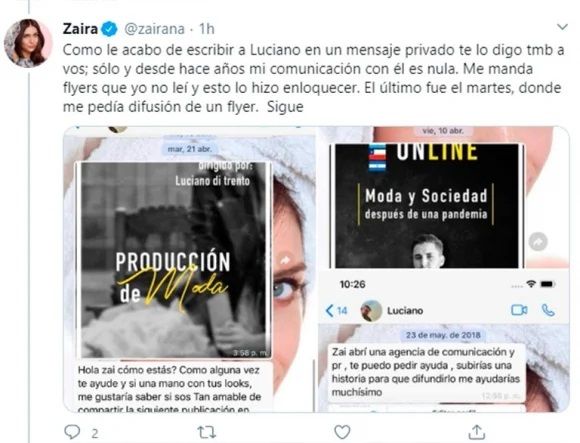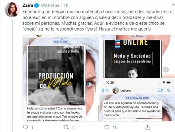 Molesta por la repercusión de los dichos de Di Trento, Zaira salió al cruce y se defendió desde Twitter: “Entiendo q no tengan mucho material para hacer notas, pero les agradecería que no ensucien mi nombre con alguien que sale a decir maldades y mentiras sobre mi persona. Muchas gracias. Aquí la evidencia de que este chico se ‘enojó’ porque no le respondí unos flyers. Hasta el martes me quería”, escribió junto a capturas de mensajes privados que le había enviado Luciano pidiéndole ayuda para promocionar sus proyectos.