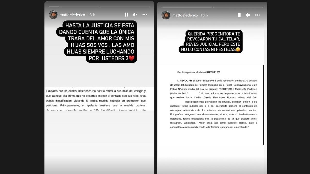 "Hasta la Justicia se está dando cuenta de que la única traba del amor con mis hijas sos vos. Las amo hijas, siempre luchando por ustedes tres", describió Matías Defederico junto a un escrito judicial que sostiene que Cinthia Fernández pondría "trabas injustificadas" para que él no pueda ver a las nenas.