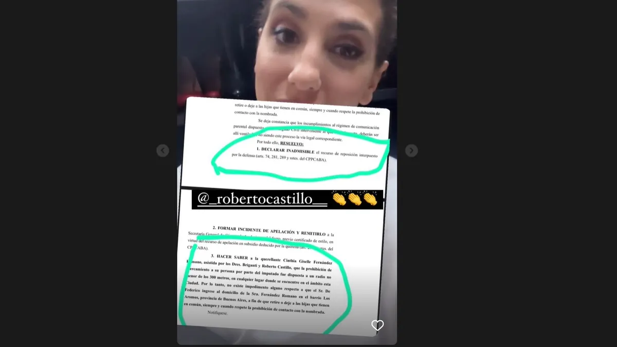 "Acá saliendo de trabajar y tengo hermosas y buenas noticias. Gracias, Roberto Castillo, el más genio de los abogados. La Justicia me dio la razón. Obviamente, yo jamás le impedí el contacto al padre con las nenas. Recordando la situación, el señor, tras la cautelar que yo le puse, que era en otra jurisdicción, lo que el Juez expresa en la resolución que les voy a mostrar dentro de un rato. Claramente, él podía ingresar al barrio", comenzó Cinthia Fernández su relato en un video.