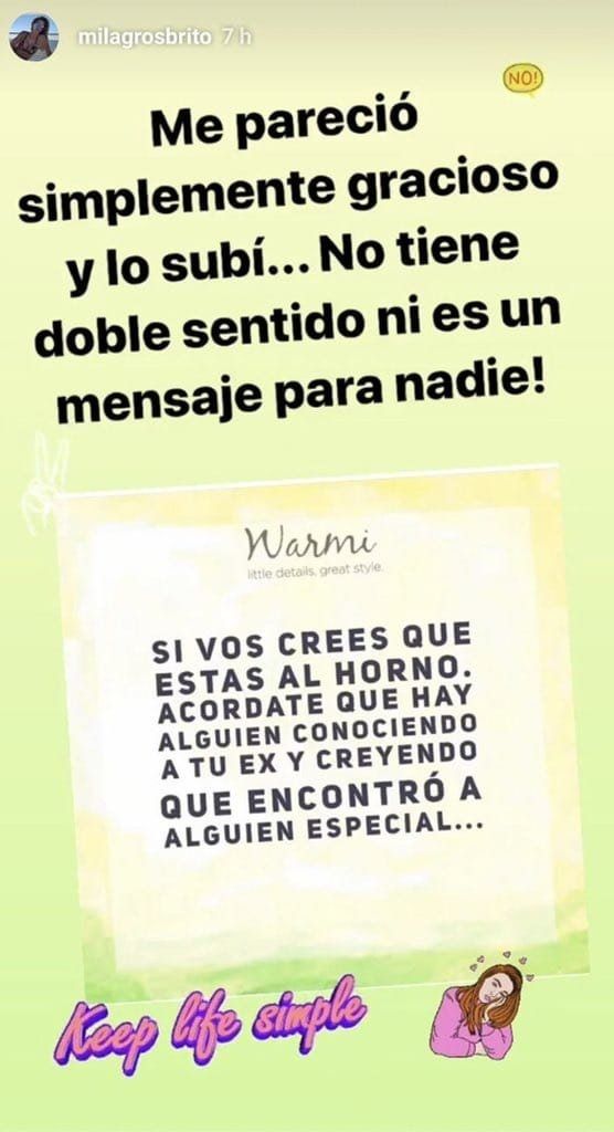 Lo cierto es que Milagros sorprendió por estas horas al publicar en sus redes sociales un mensaje que pareciera estar dedicado a la modelo y a su ex: "Si vos creés que estás al horno, acordate de que hay alguien conociendo a tu ex y creyendo que encontró a alguien especial".