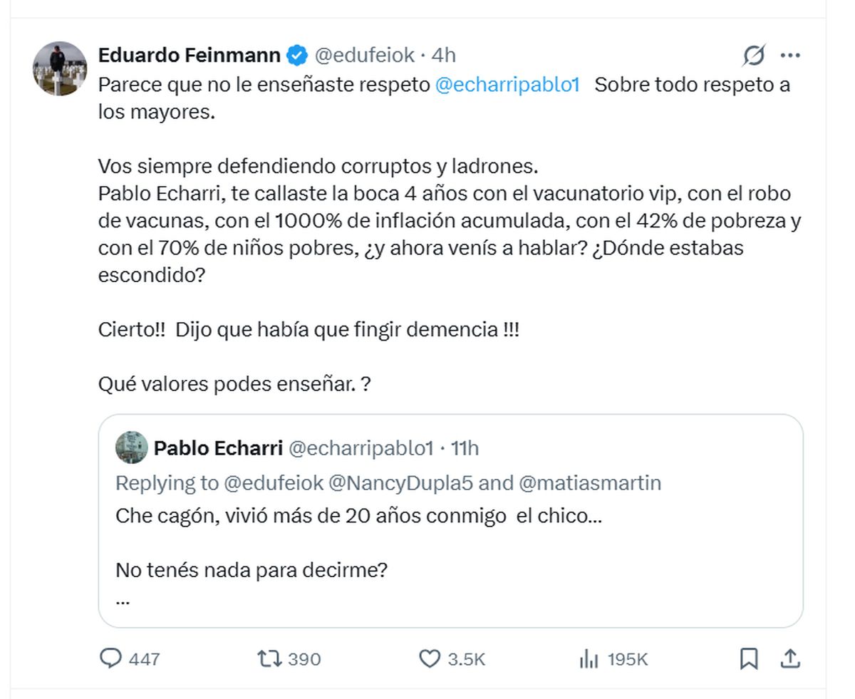 La réplica de Feinmann no tardó en llegar y fue igual de contundente: "Parece que no le enseñaste respeto, Pablo Echarri. Sobre todo respeto a los mayores".