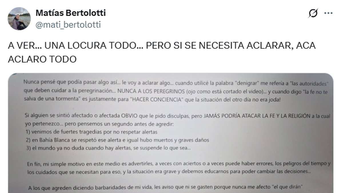 Además, defendió su labor profesional y la importancia del trabajo meteorológico. “La fe nunca puede estar por encima de tu vida, por más que aparezcan boludos a bardear con el pronóstico, nosotros estudiamos justamente para informar sobre eventos severos”, sostuvo.