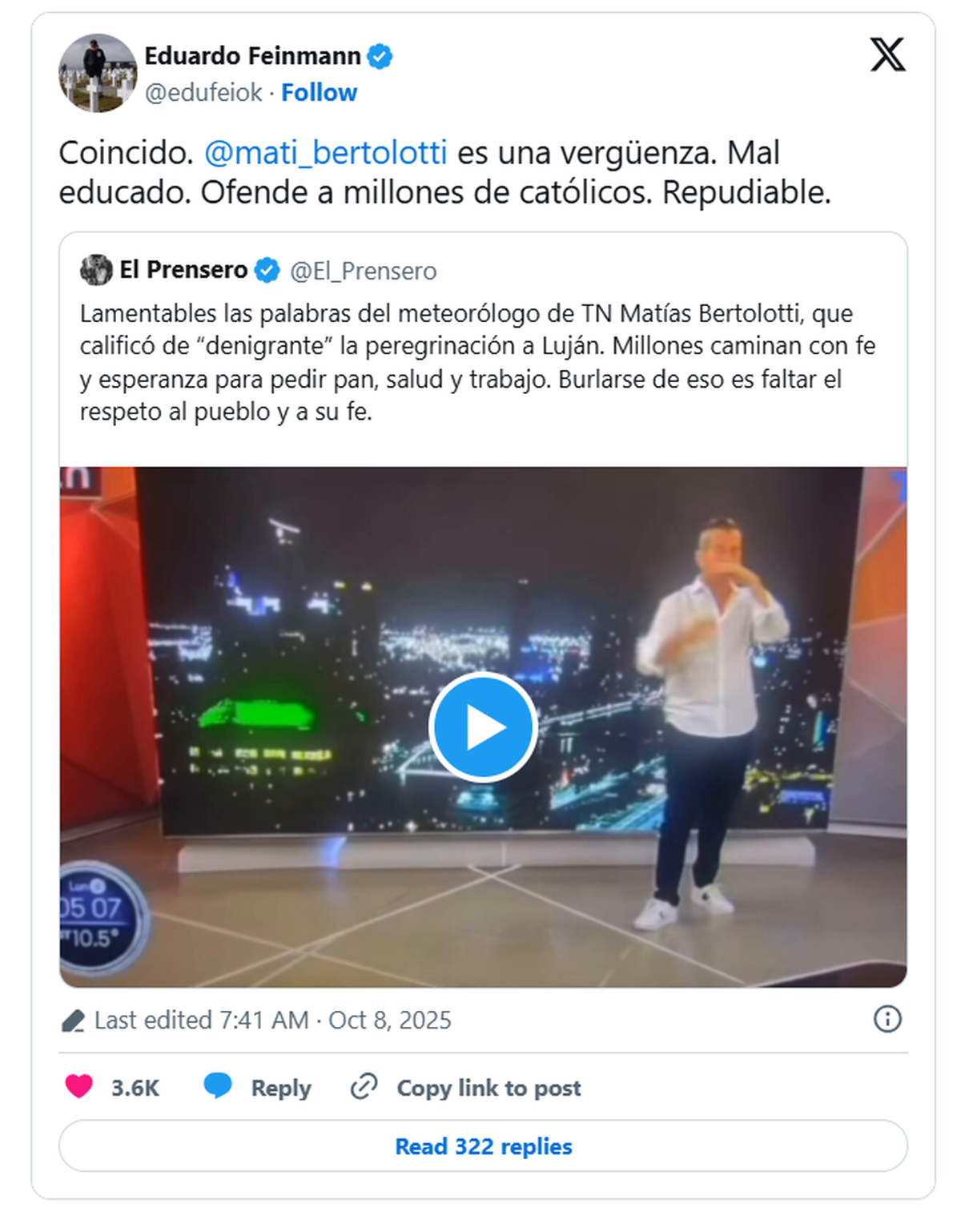 Por último, le restó importancia a los insultos que recibió en redes sociales y cerró con ironía: “Igual, los insultos me los paso por los...”. De esta forma, un comentario que buscaba llamar la atención sobre la seguridad terminó desatando un intenso debate sobre los límites entre la fe, la responsabilidad y la comunicación pública.