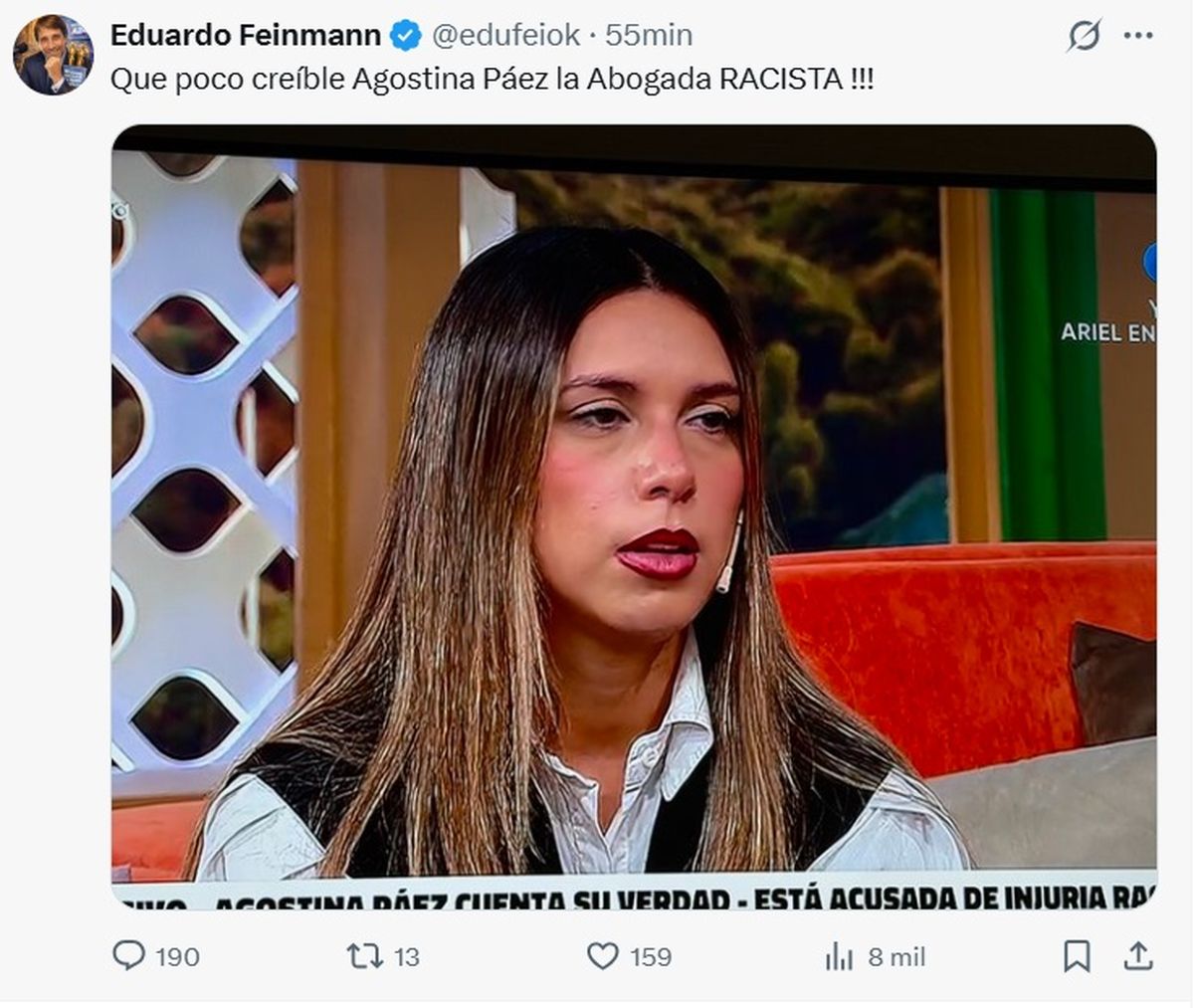 Y en otro mensaje continuó indignado por la aparición en los medios de Agostina Páez y cuestionó su relato: "Que poco creíble Agostina Páez la abogada racista".