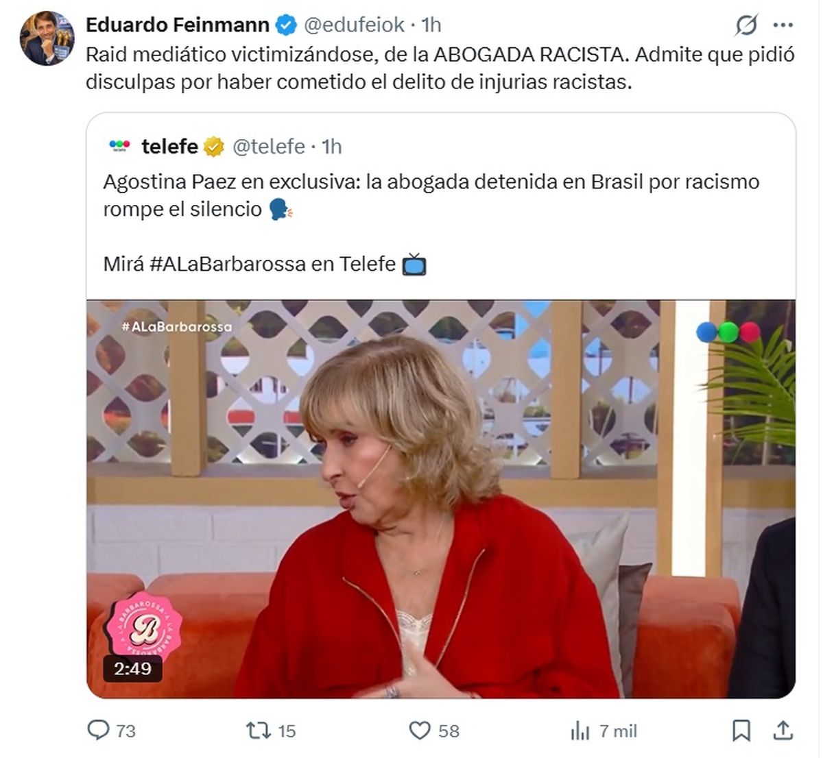 Luego, al ver a Agostina Páez al aire con Georgina Barbarossa, el periodista comentó: "Raid mediático victimizándose, de la abogada racista. Admite que pidió disculpas por haber cometido el delito de injurias racistas".