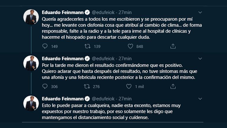 “Quería agradecerles a todos los que me escribieron y se preocuparon por mí. Hoy me levanté con disfonía, cosa que atribuí al cambio de clima...De forma responsable, falté a la radio y a la tele para irme al Hospital de Clínicas y hacerme el hisopado para descartar cualquier duda”, explicó Feinmann en su cuenta de Twitter.