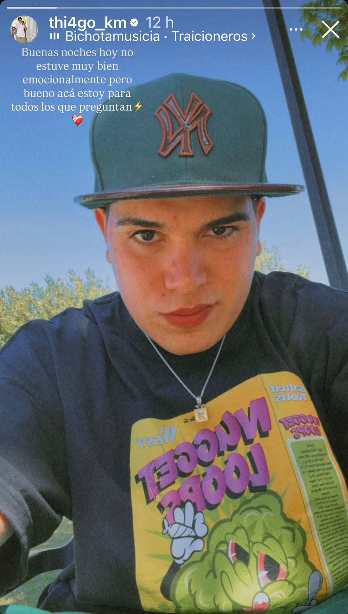 A través de una historia de Instagram, Thiago Medina publicó una selfie en la que se lo notaba serio y con gesto apagado, acompañada de una frase que dejó entrever su estado anímico. “Hoy no estuve muy bien emocionalmente, pero bueno acá estoy para todos los que preguntan”, escribió, sumando un emoji de corazón herido y otro de rayo, lo que generó aún más preocupación entre quienes lo siguen.