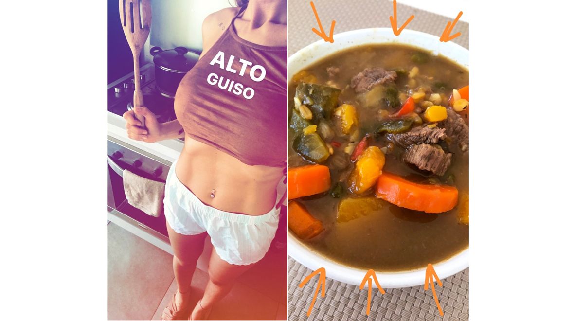 La sensual actriz subió un par de imágenes de su talento como cocinera para hacer un guiso con todo: carne, verduras, caldo y más.