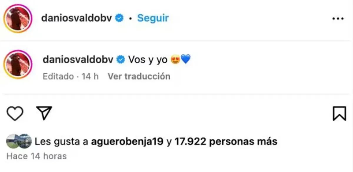 Para sorpresa de muchos de los seguidores de Daniel Osvaldo, la publicación recibió un "me gusta" de parte de Benja, el hijo del Kun Agüero y Gianinna Maradona, ex pareja de hoy músico.