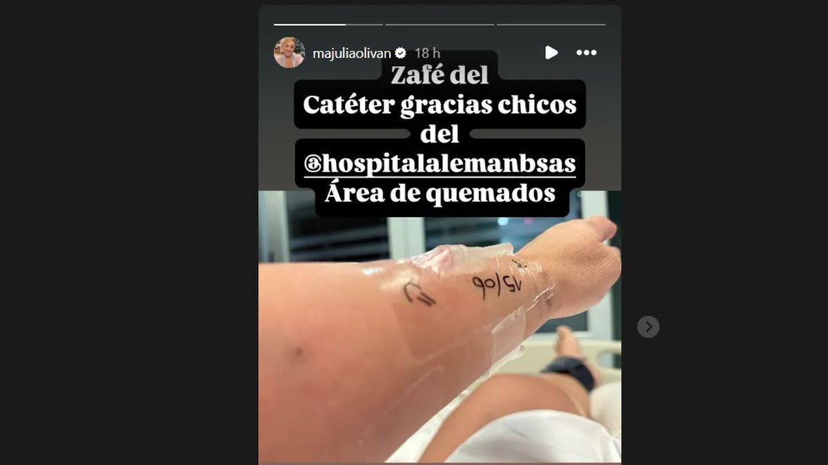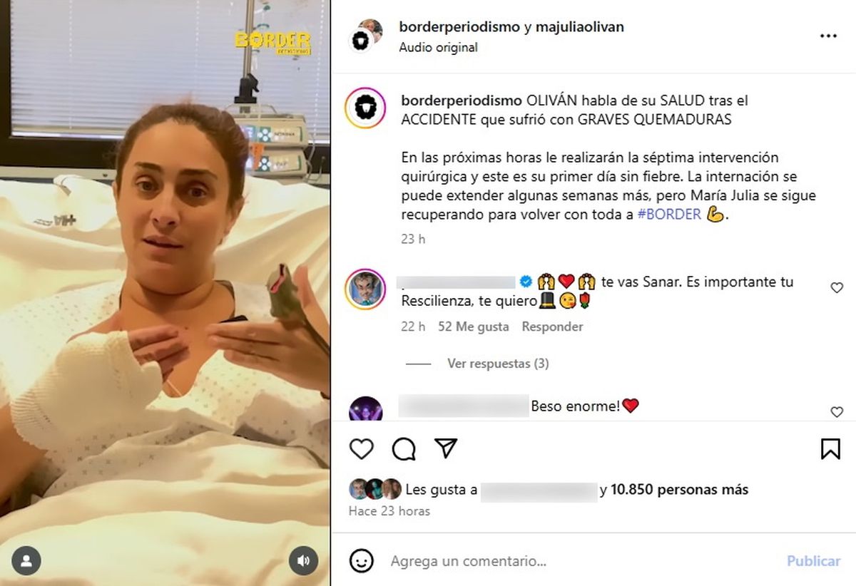 “Oliván habla de su salud tras el accidente que sufrió con graves quemaduras. En las próximas horas le realizarán la séptima intervención quirúrgica y este es su primer día sin fiebre", informaron las redes sociales de Border Periodismo en un posteo conjunto con la cuenta de María Julia Oliván, así como también aclararon que “la internación se puede extender algunas semanas más”.