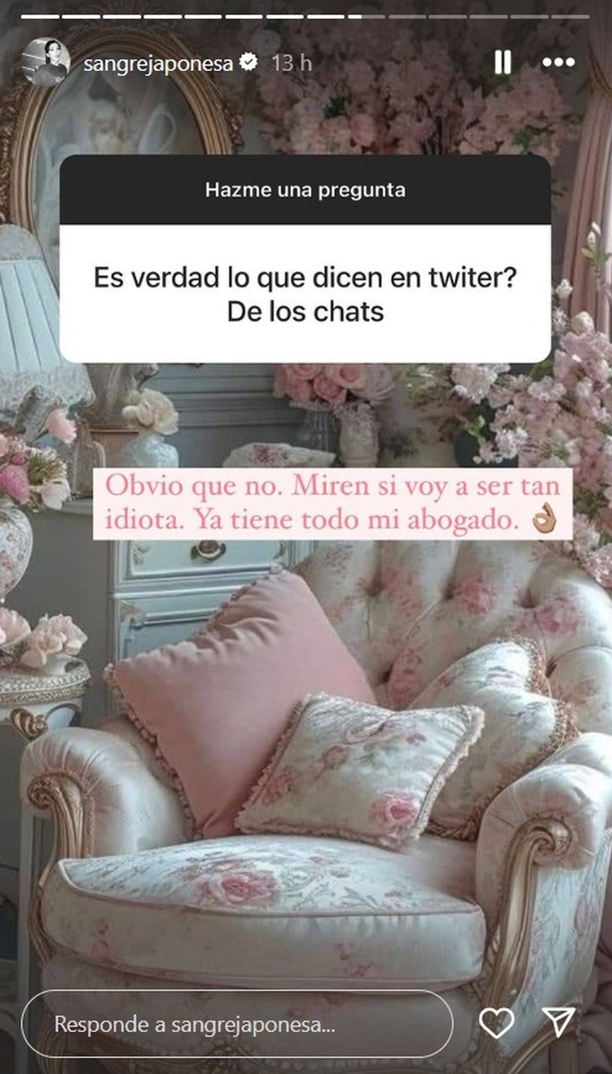 "¿Es verdad lo que dicen en Twitter? de los chats", le consultó un seguidor a la actriz y cantante. Y ella contestó categórica sobre este tema: "Obvio que no. Miren si voy a ser tan idiota. Ya tiene todo mi abogado".