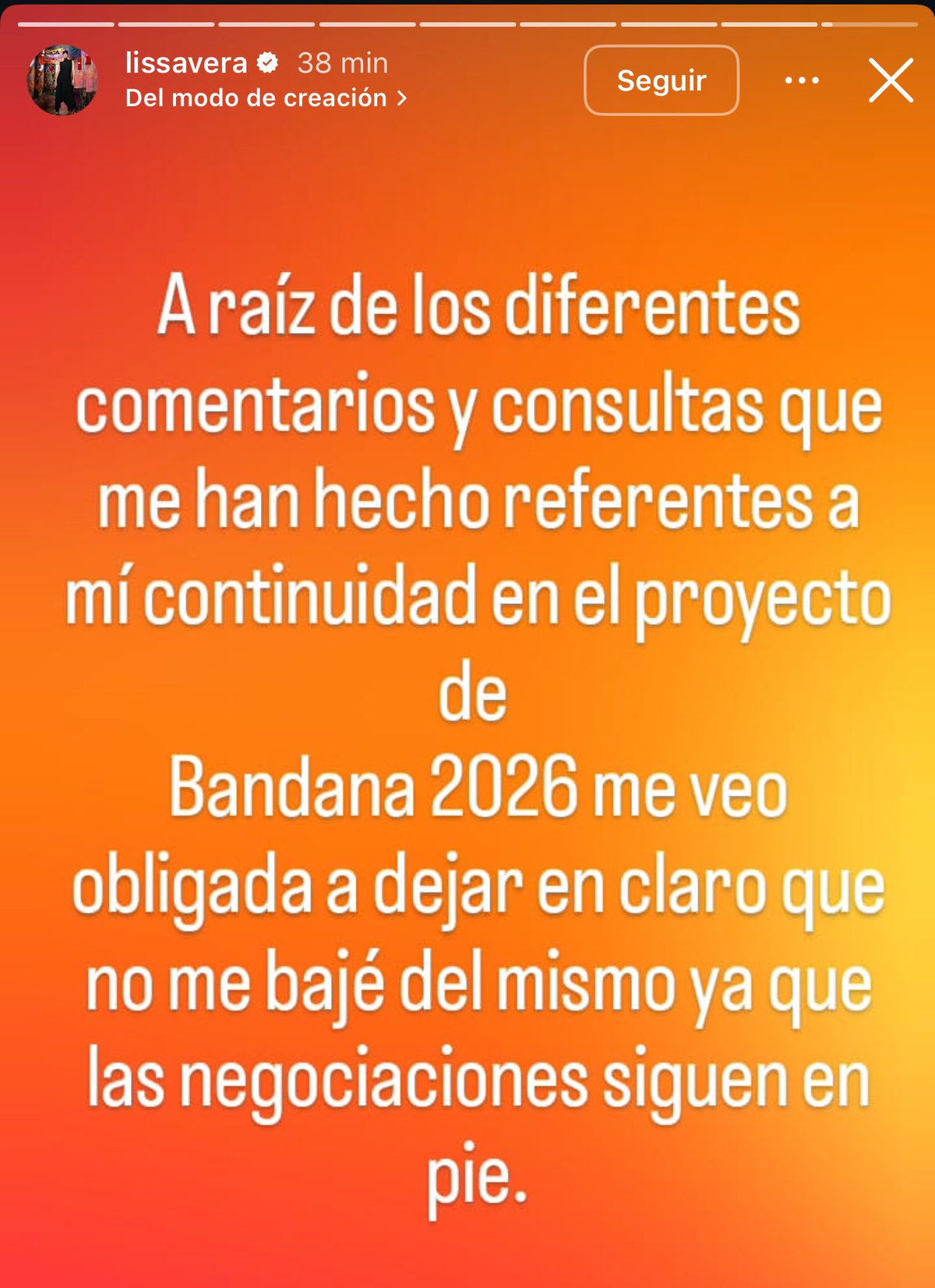 Frente a esa situación, Lissa decidió expresarse públicamente a través de su cuenta de Instagram. En su mensaje aclaró:"A raíz de los diferentes comentarios y consultas que me han hecho referentes a mí continuidad en el proyecto de Bandana 2026 me veo obligada a dejar en claro que no me bajé del mismo ya que las negociaciones siguen en pie". Con esta frase, negó que su salida esté confirmada y remarcó que su continuidad depende de conversaciones que aún no finalizaron.