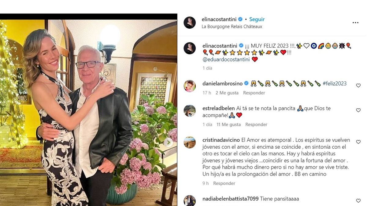 "¡¡¡MUY FELIZ 2023!!!", expresó la mendocina en Instagram con distintos emojis y en donde aparece el de un bebé y varios corazones. Además, en la foto junto a Costantini, se puede apreciar su incipiente pancita de embarazada.