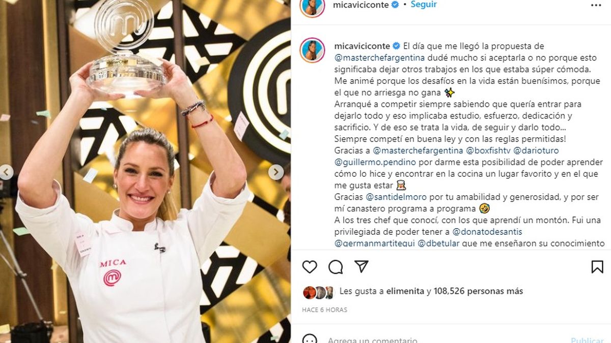 El jurado de Masterchef Celebrity, en la voz de Damián Betular, anunciaba que Mica Viciconte era la ganadora de la tercera edición del reality, que obtuvo altos picos de rating en la noche de lunes.