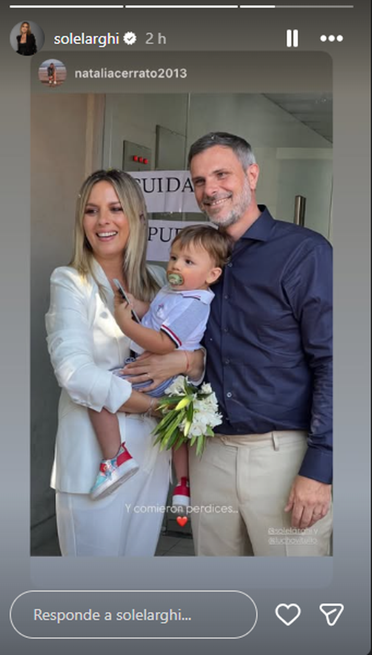 Entre las fotos que publicó en sus historias, se destaca una en la que aparece abrazada a su pareja tras dar el “sí”, rodeada de familiares y amigos íntimos. Incluso, Larghi también subió una imagen familiar en la que posa junto al periodista y su pequeño, Dante.