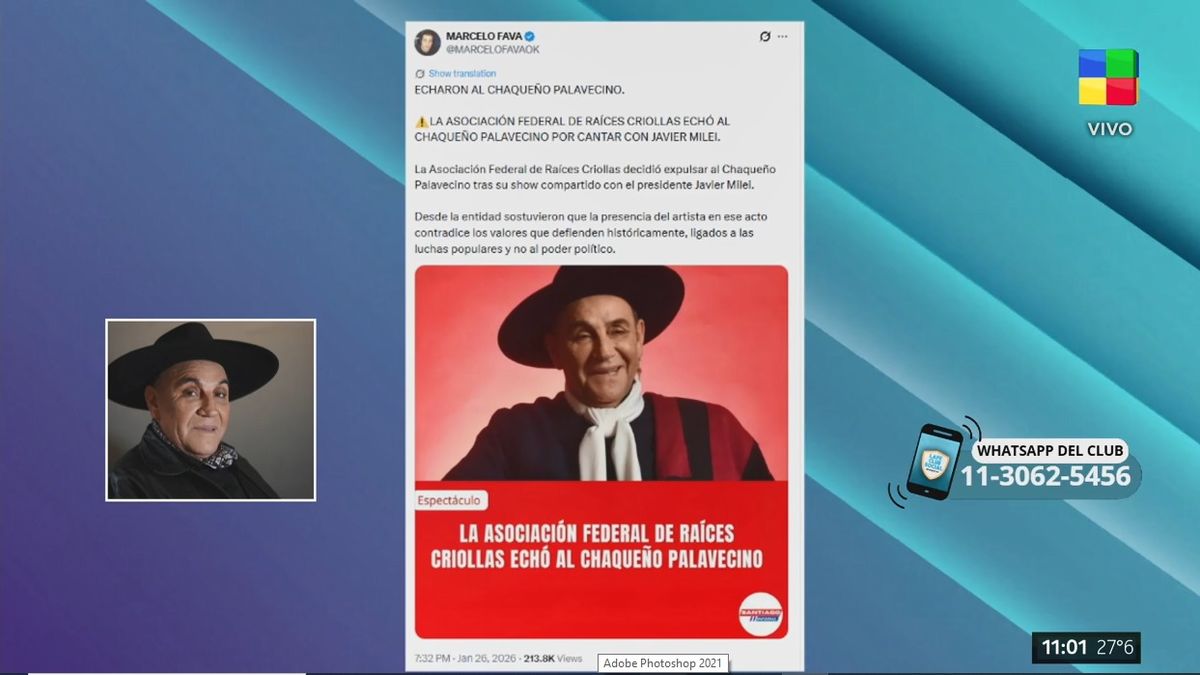 Lo cierto es que Mauro Szeta y Martín Salwe compartieron en el ciclo de América TV el mensaje de X publicado por un usuario de nombre Marcelo Fava informando que la Asociación Federal de Raíces Criollas "echó al Chaqueño Palavecino por cantar con Javier Milei".