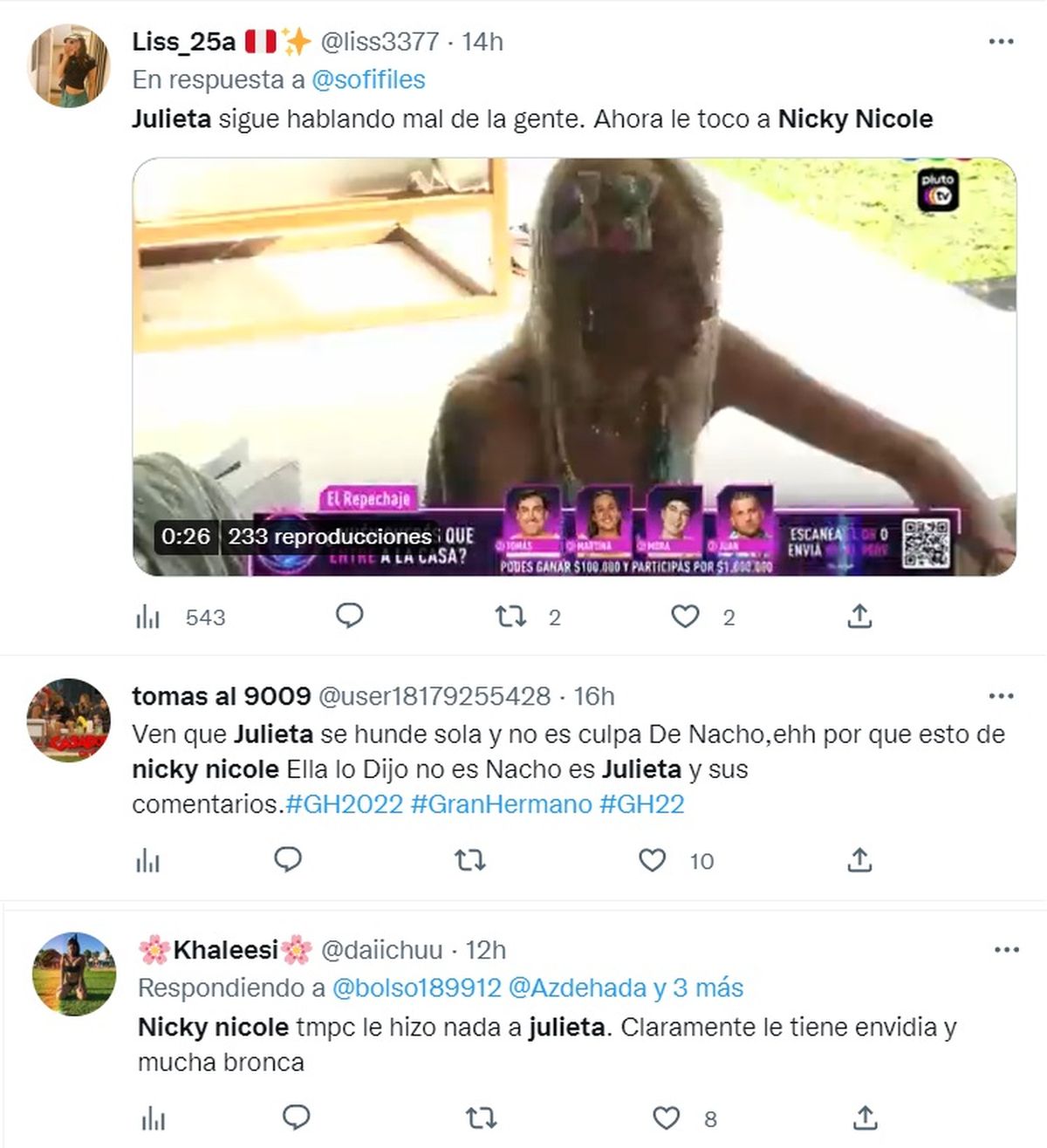 "Ven que Julieta se hunde sola y no es culpa De Nacho, ehh por que esto de Nicky Nicole Ella lo Dijo no es Nacho es Julieta y sus comentarios.#GH2022", precisó un usuario.