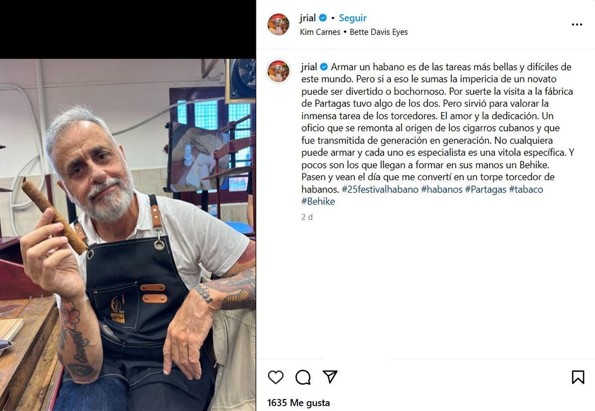 "Un oficio que se remonta al origen de los cigarros cubanos y que fue transmitida de generación en generación. No cualquiera puede armar y cada uno es especialista es una vitola específica. Y pocos son los que llegan a formar en sus manos un Behike. Pasen y vean el día que me convertí en un torpe torcedor de habanos", cerró su posteo Jorge Rial.