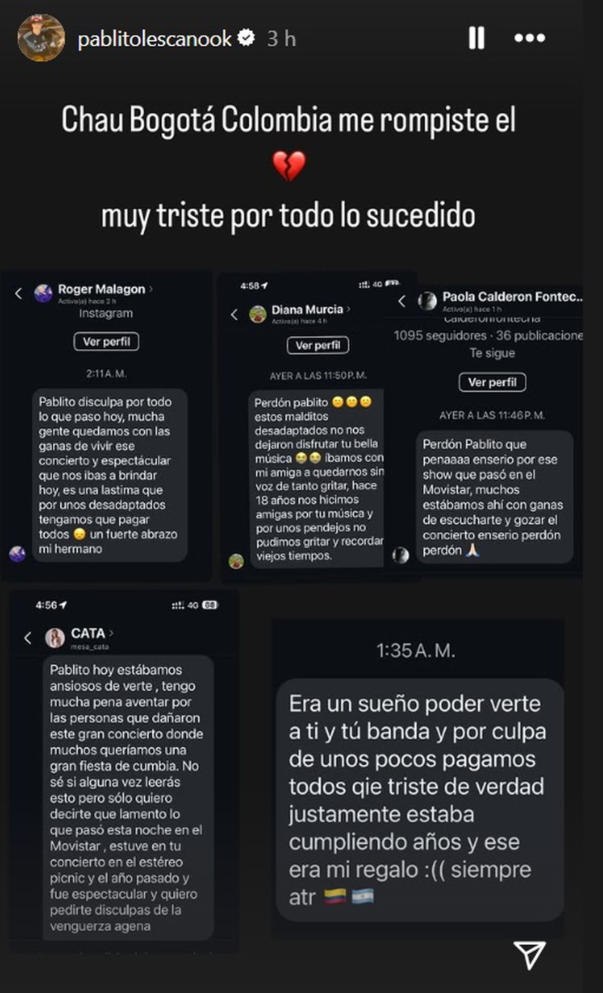 La primera reacción del cantante Pablo Lescano ante la gravedad de lo sucedido fue a través de sus historias de Instagram con un mensaje totalmente destrozado por lo ocurrido.